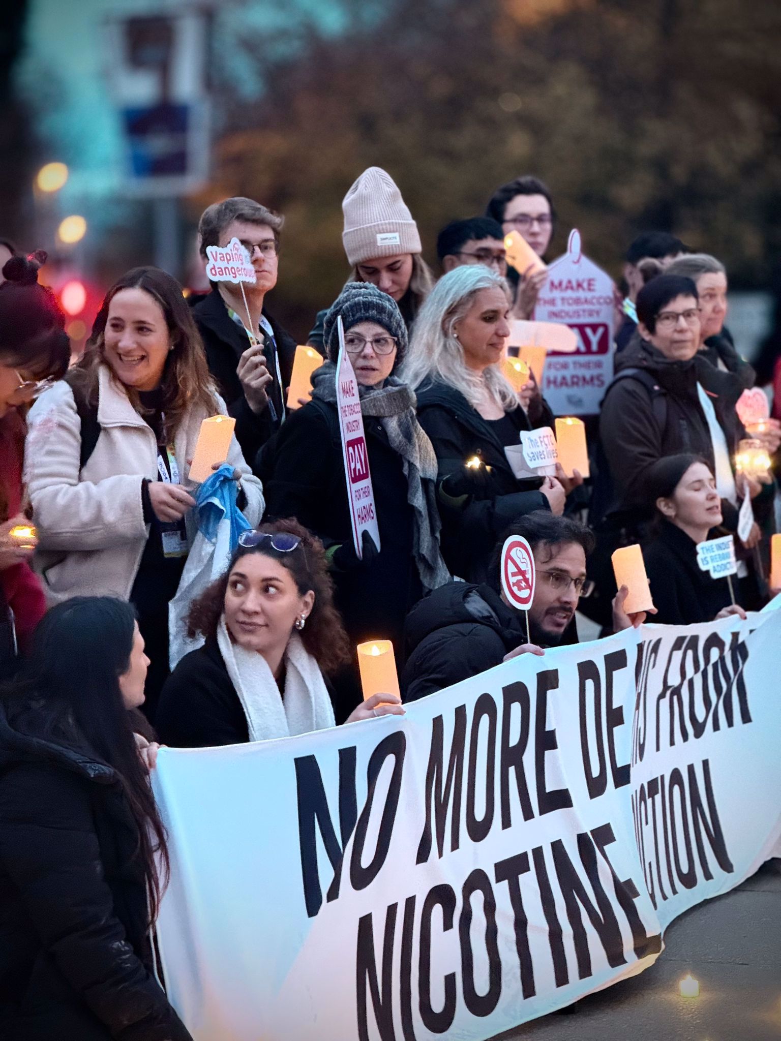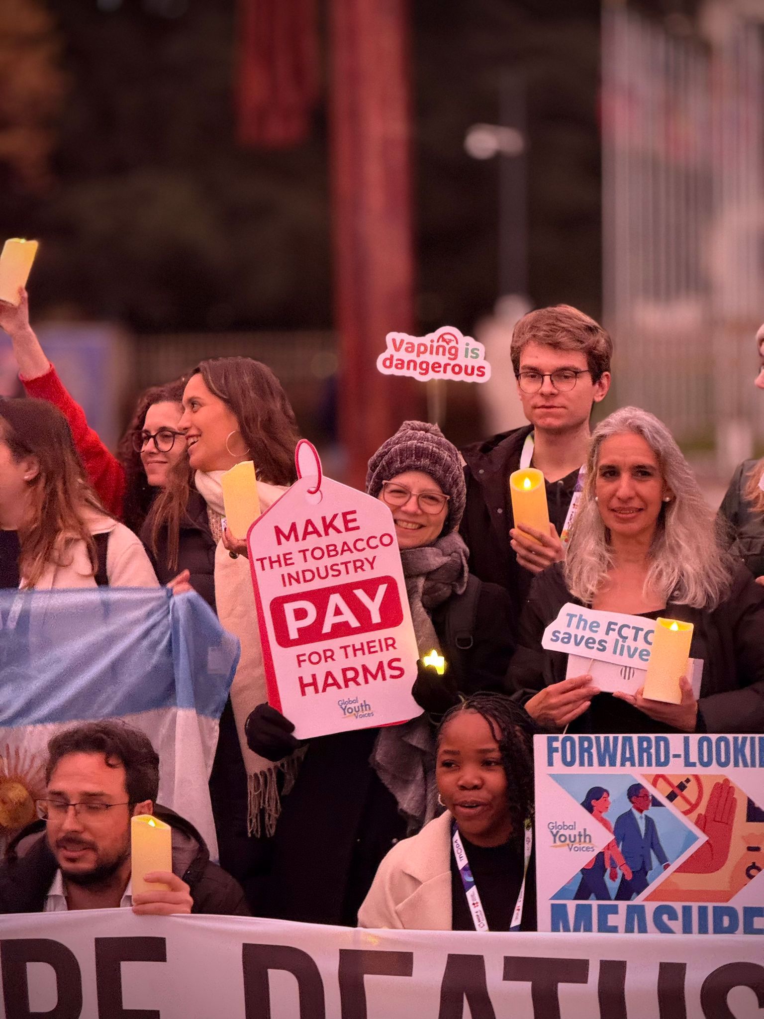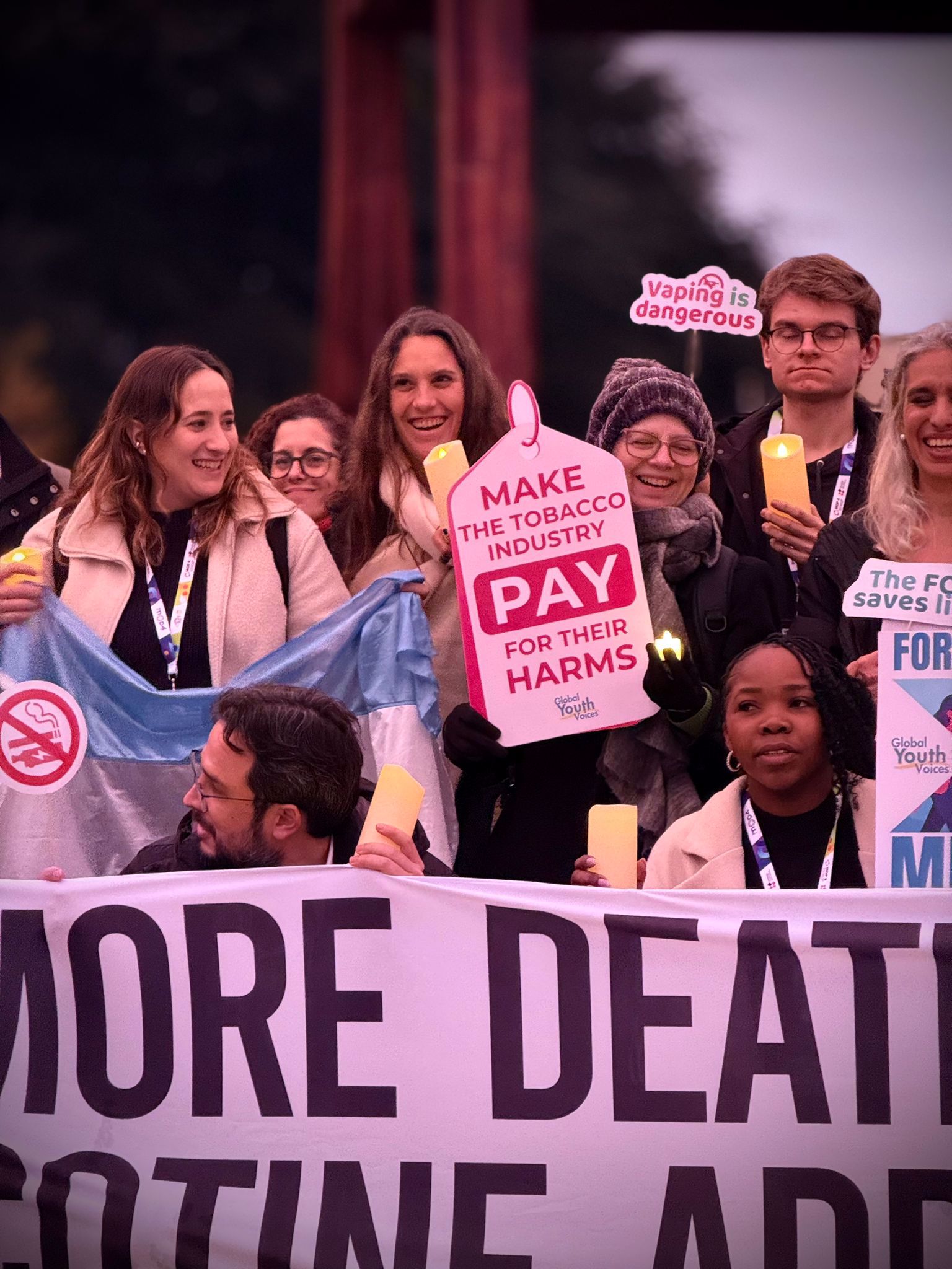Over two days, young advocates from across the world carried out a series of coordinated activities at Place des Nations in Geneva, next to the emblematic Broken Chair installation. These actions ranged from visual art and live performances to traditional and social media outreach. Beginning on Sunday evening, participants held a candlelit gathering and displayed messages calling attention to the tobacco industry’s manipulative practices. They also urged stronger measures to protect public health and safeguard young people from all tobacco products, including electronic cigarettes.